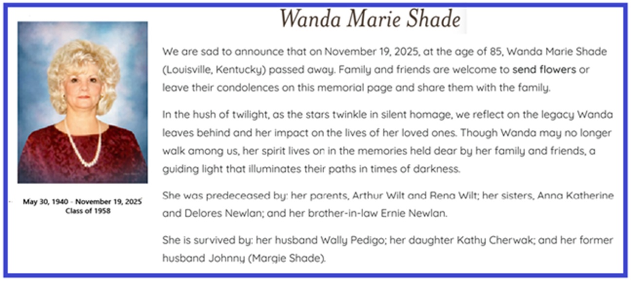 | Wanda Marie (Wilt) Shade | May 30, 1940 | November 19, 2025 | 1958 |